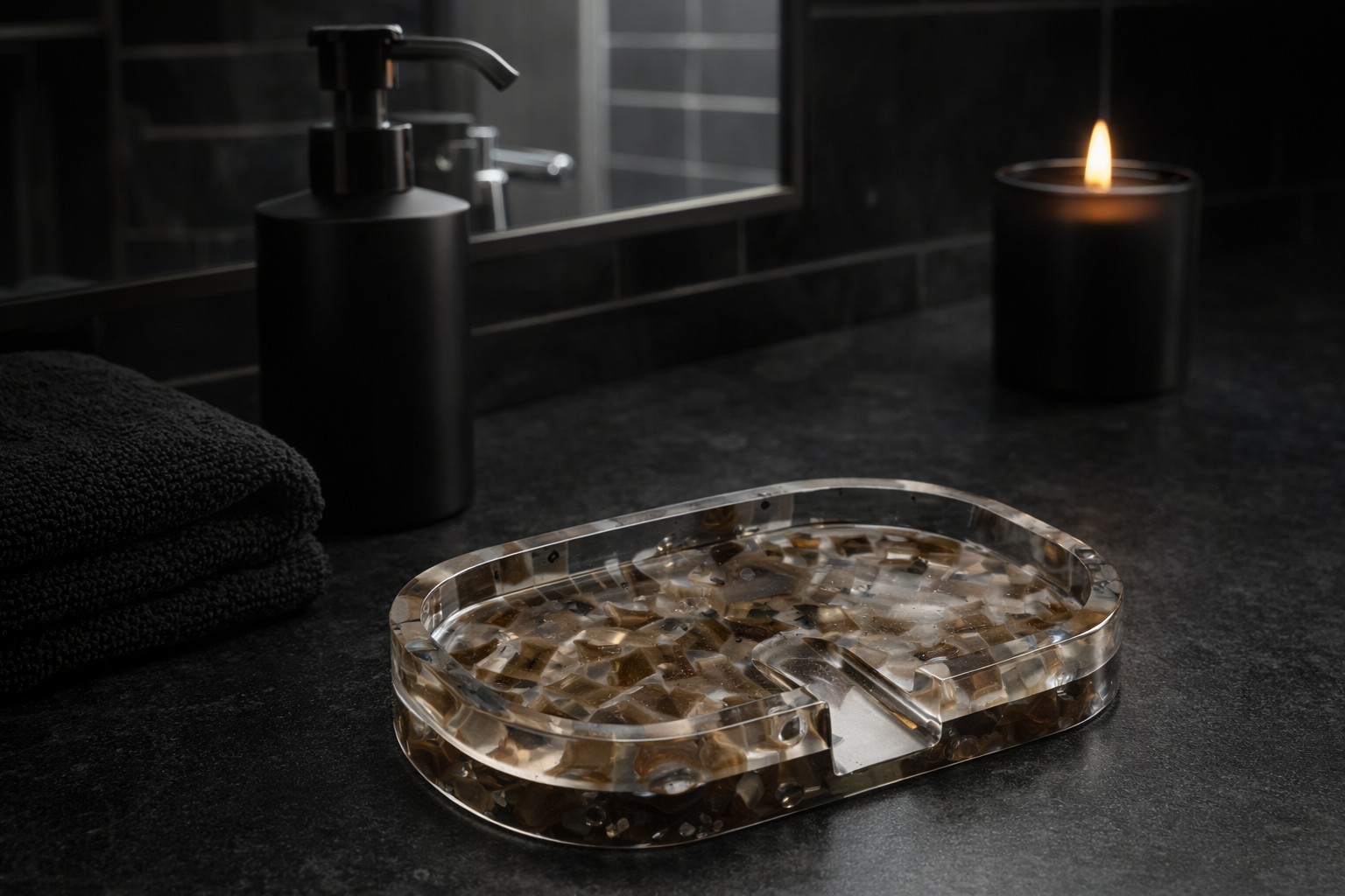 This collection is where water meets design—glimmering pearl tones, and luminous epoxy come together in pieces that feel both modern and rooted. The Pearl Collection is crafted from recycled materials, transforming discarded fragments into intentional design. Each detail holds the story of reinvention—elegant, moody, and made to last.
