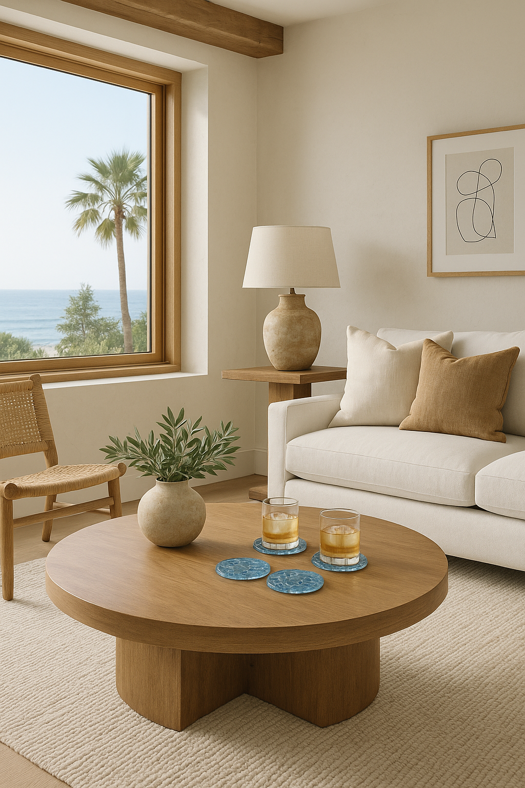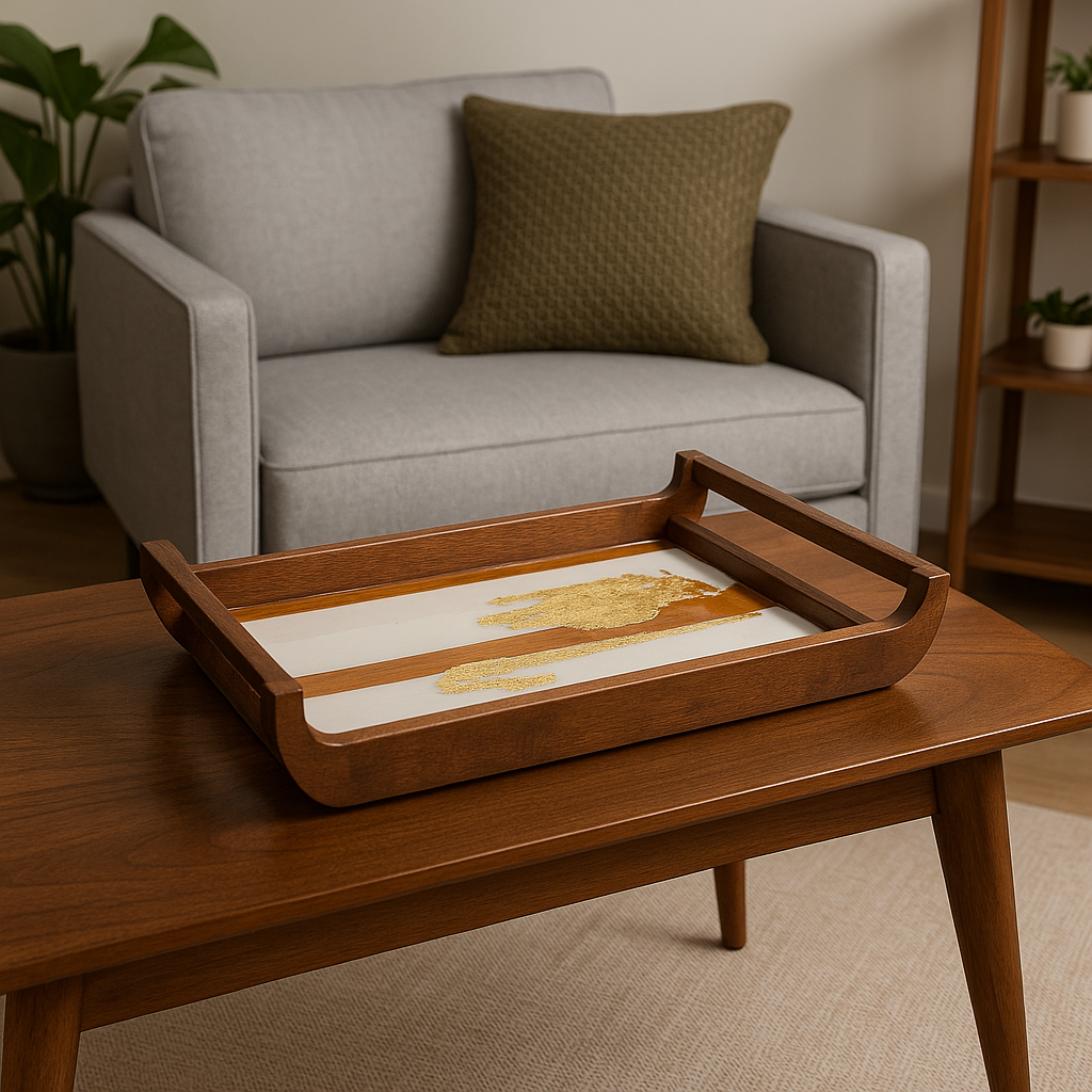 This collection is where water meets design—glimmering aqua tones, woodgrain, and luminous epoxy come together in pieces that feel both modern and rooted. The Tide+Terra Collection is crafted from recycled materials, transforming discarded fragments into intentional design. Each detail holds the story of reinvention—elegant, moody, and made to last.